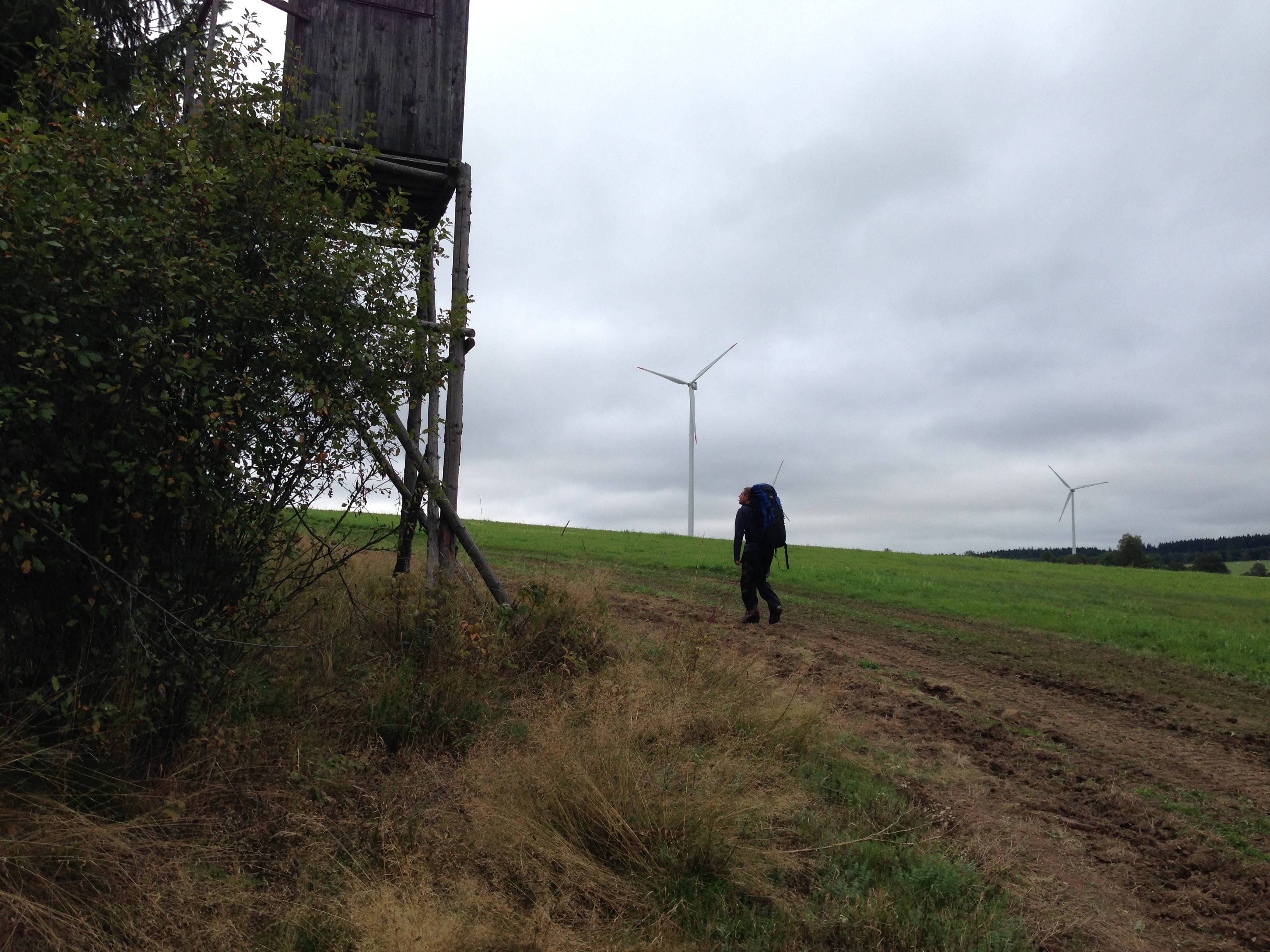 Tak se to konečně podařilo! Začalo to nápadem mít něco svýho, kam můžeme jen tak vypadnout, zdusit se (pokud možno výkonem ;-), pročistit palice, prostě si to užít. Následovala euforie mnohých nápadem oslovených a jejich následné postupné vystřízlivění. No a tak tři nejstatečnější stojíme na startu, teda nakonec jenom dva, jelikož ten třetí, Křižák, nám doma drží palce a chrchlá a chystáme se započít dlouhé putování po hranicích Česka. Nevíme kdy, zda vůbec a v jaké sestavě těch více než 2.300km pokoříme, víme jen že to bude zábava na pěkně dlouho, že když jí dokončíme, budeme o dost starší, ale taky o dost bohatší – o čem bychom taky těm našim vnoučatům vyprávěli, o businessu dost těžko 😉 Začínáme na západě, v Aši a volíme směr hodinových ručiček. První etapu poznamenávají dvě zásadní události; setrvalý déšť a naše tragická nepřipravenost a nezkušenost. Ale popořádku. Auto parkujeme u Lidlu, kde se zdá jakž takž bezpečno, nasazujeme těžké batohy vybavené na přenocování v přírodě a vyrážíme. Začíná mrholit. Brzy se stáčíme k severozápadu a vstupujeme do místních hustých lesů. Všude mraky hub, jen mít čas a náladu je sbírat. Záhy se sem tam nad korunami stromů tyčí tiše bzučící větrníky.